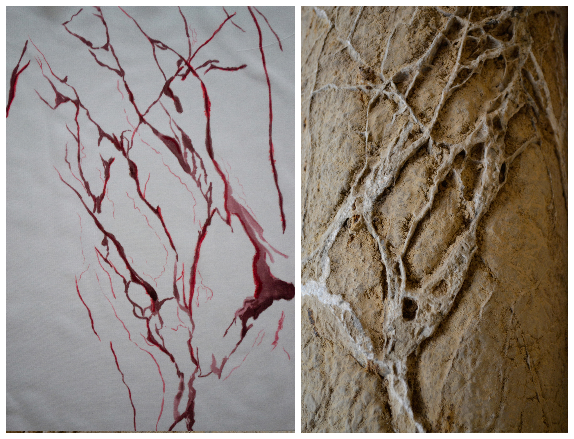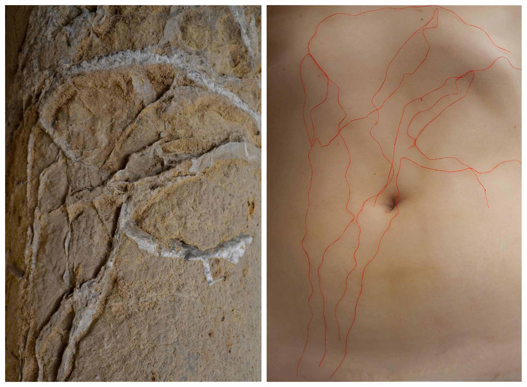 O vergalhão exposto da pedra faz lembrar um fóssil, a memória do tempo impressa na matéria morta. Remete à malha sanguínea e aos vincos da pele, linhas da vida.